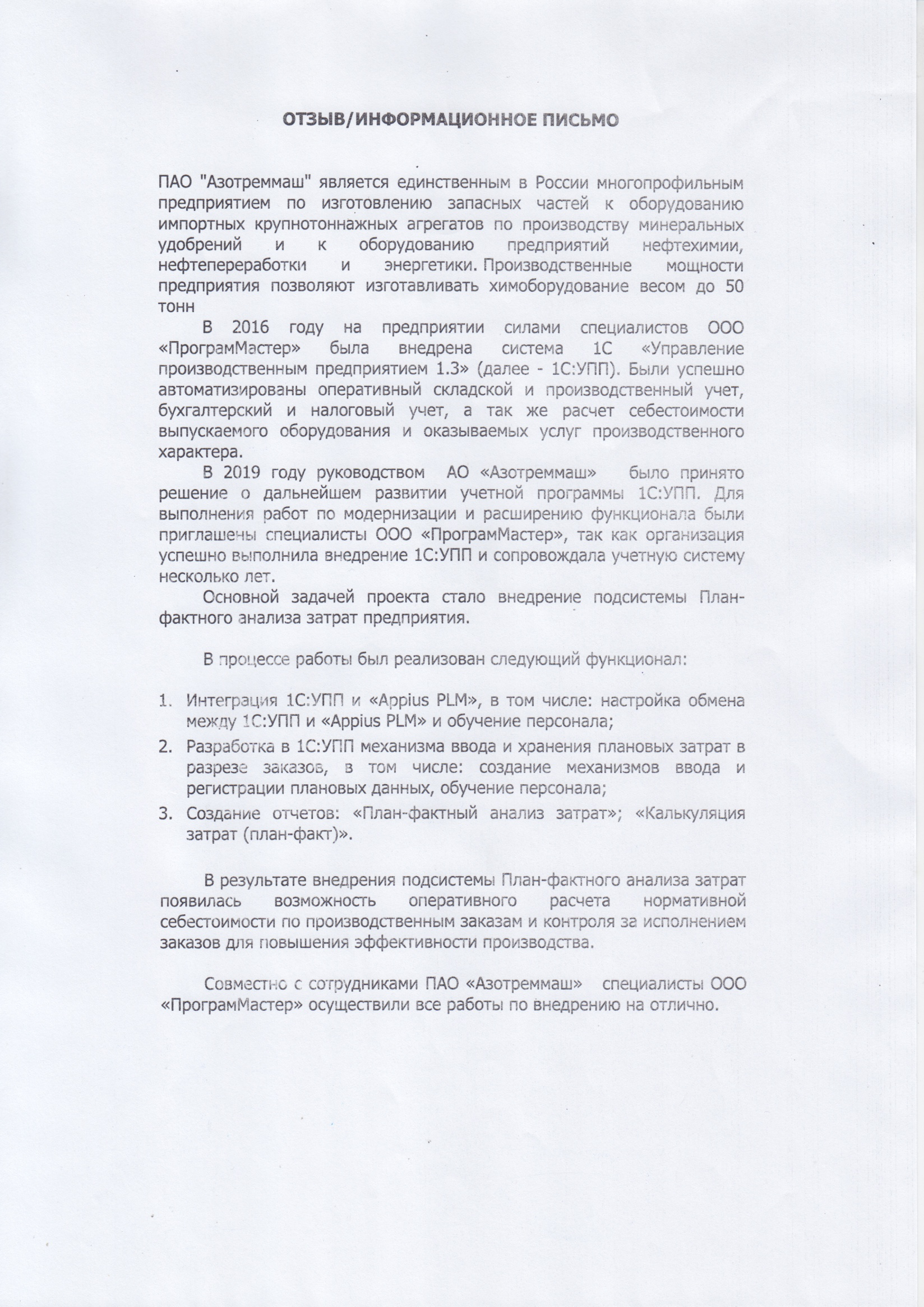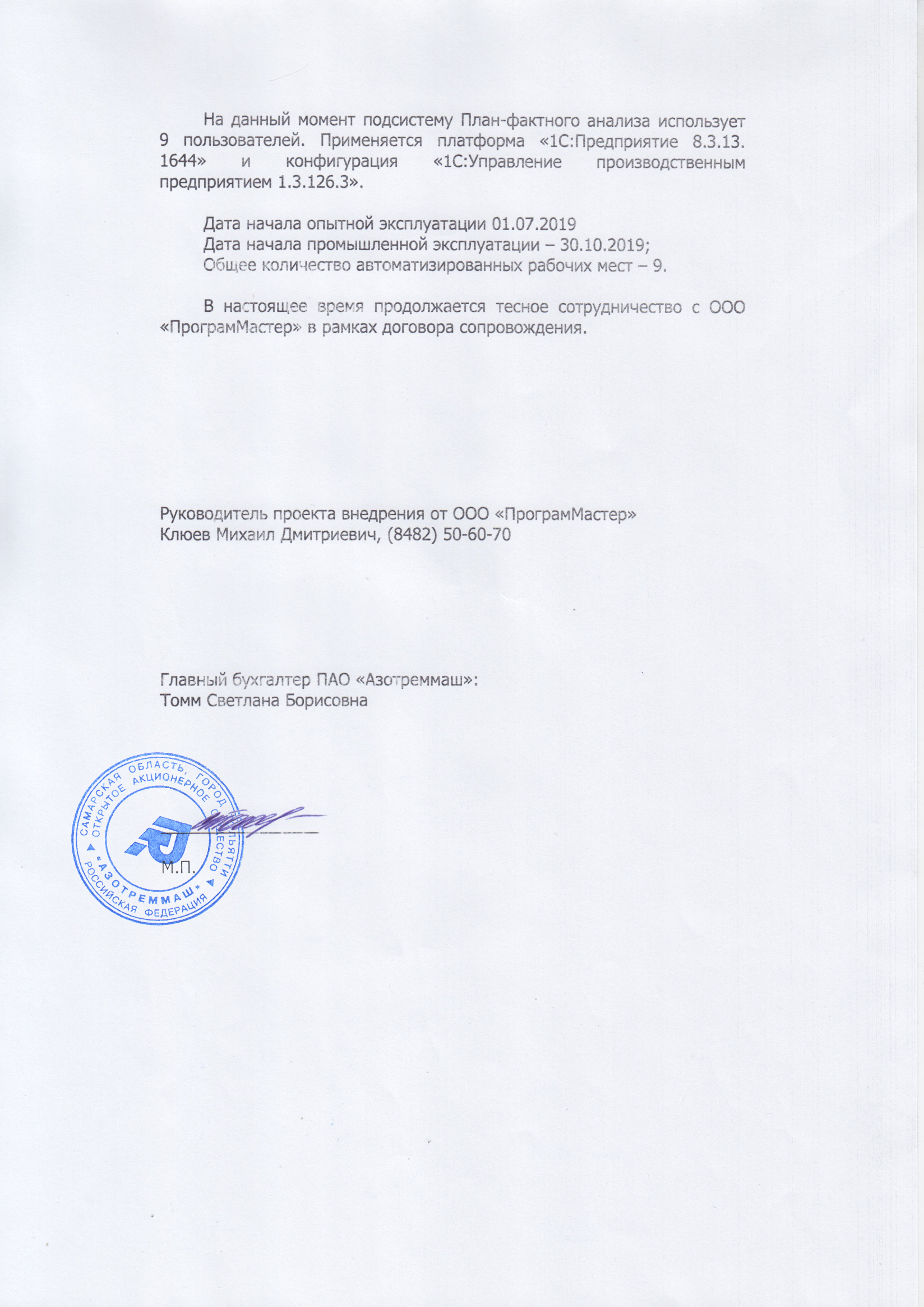Совместно с сотрудниками АО «Азотреммаш» специалисты ООО «ПрограмМастер» осуществили все работы по внедрению на отлично.