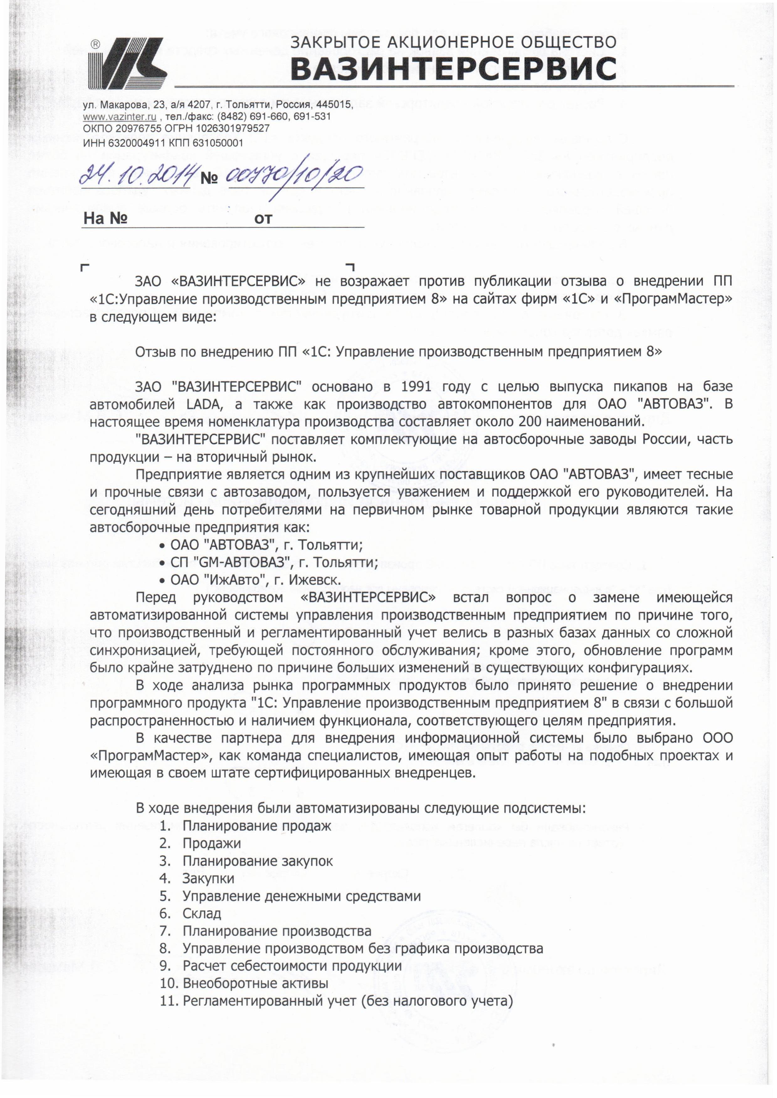 ЗАО «ВАЗИНТЕРСЕРВИС» (1С:УПП) - 2014г.