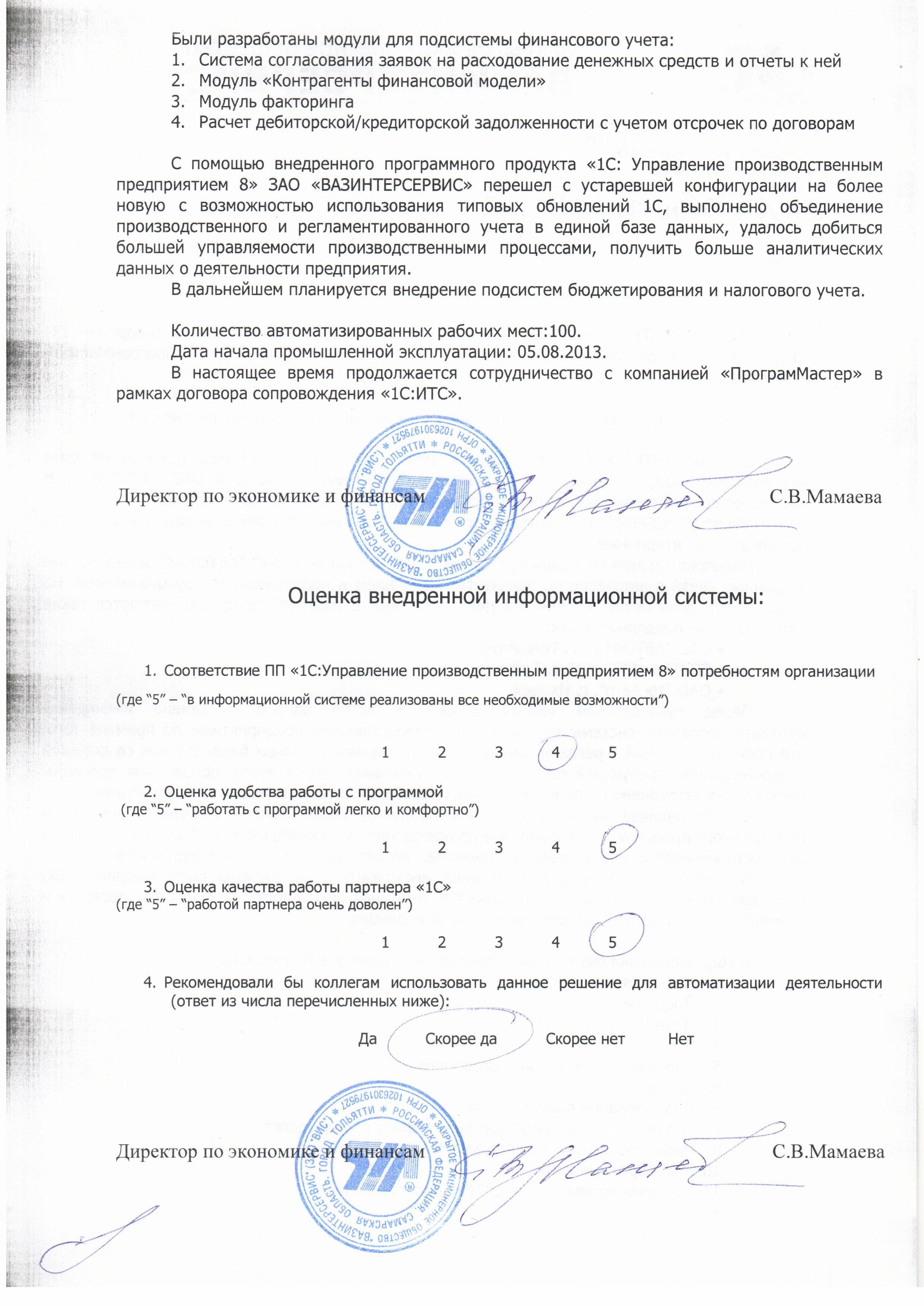 С помощью внедренного программного продукта «1С: Управление производственным предприятием 8» ЗАО «ВАЗИНТЕРСЕРВИС» перешел с устаревшей конфигурации на более новую с возможностью использования типовых обновлений 1С, выполнено объединение производственного и регламентированного учета в единой базе данных, удалось добиться большей управляемости производственными процессами, получить больше аналитических данных о деятельности предприятия.