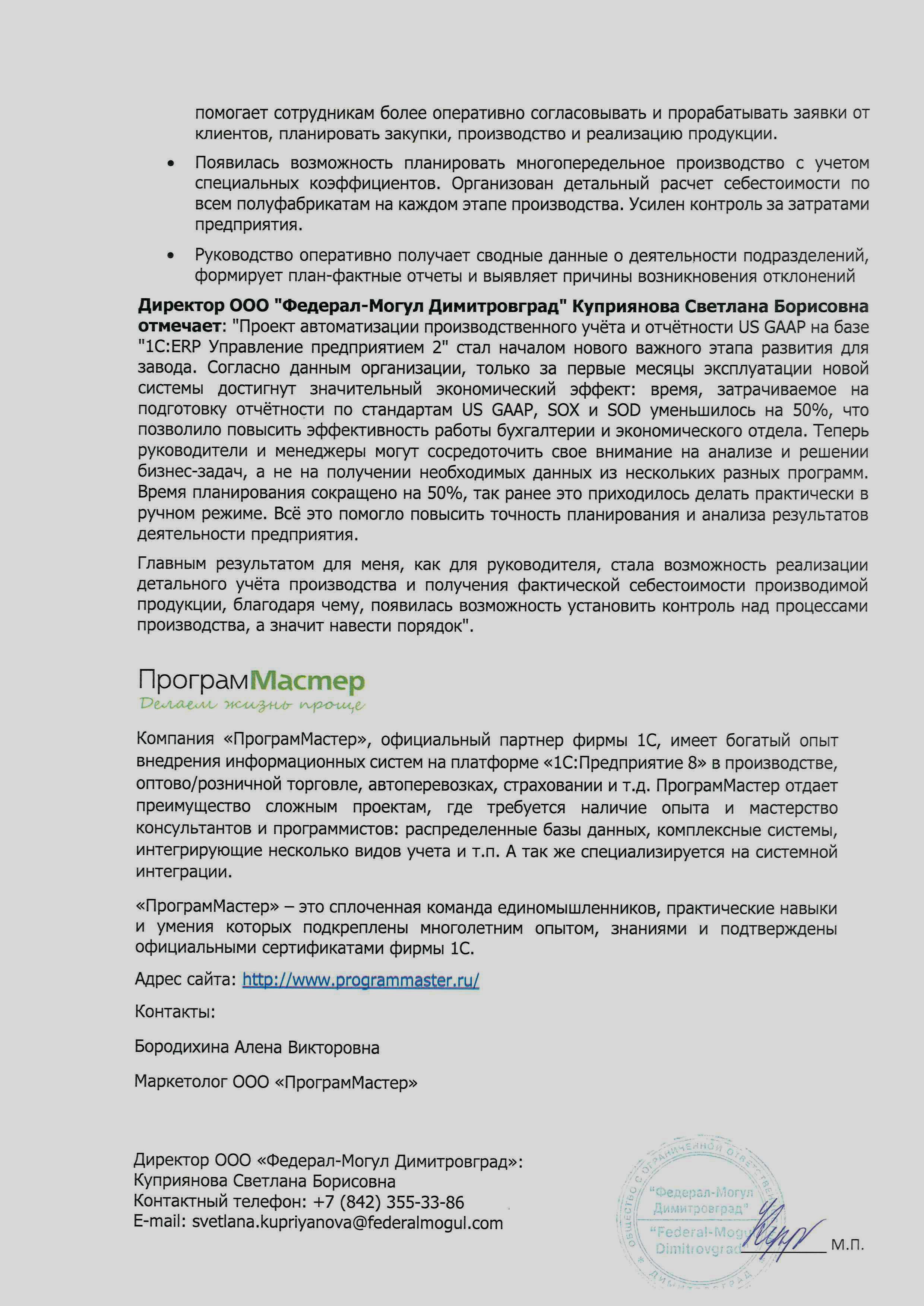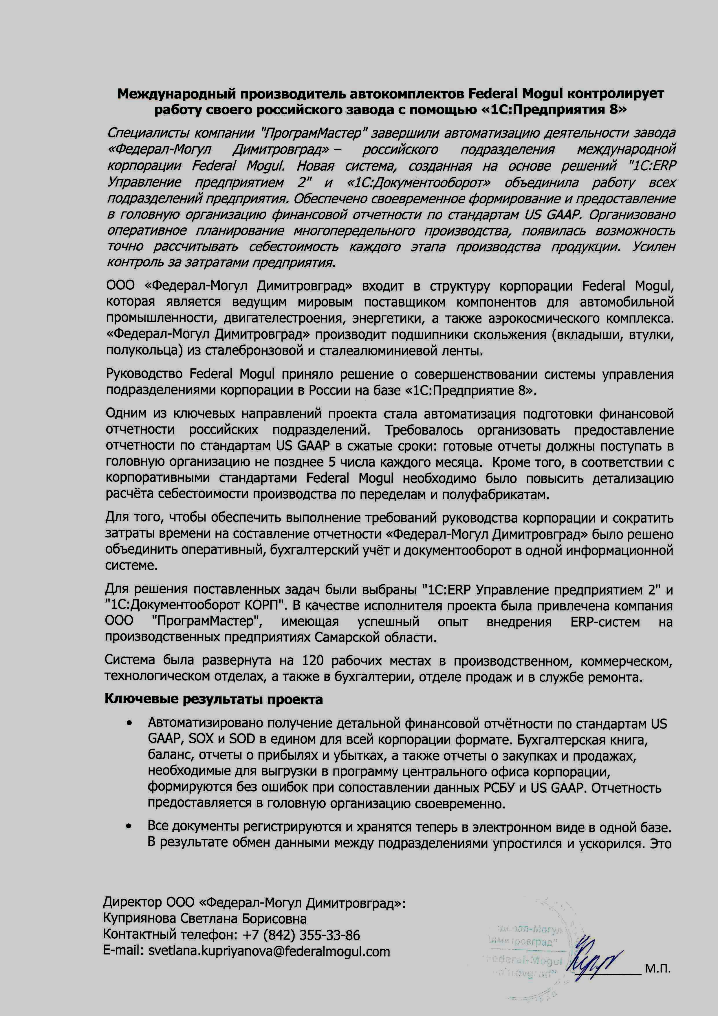 Директор ООО "Федерал-Могул Димитровград" Куприянова Светлана Борисовна отмечает: "Проект автоматизации производственного учёта и отчётности US GAAP на базе "1С:ERP Управление предприятием 2" стал началом нового важного этапа развития для всей компании. Согласно данным организации, только за первые месяцы эксплуатации новой системы достигнут значительный экономический эффект: время, затрачиваемое на подготовку отчётности по стандартам US GAAP, SOX и SOD уменьшилось на 50%, что позволило повысить эффективность работы бухгалтерии и экономического отдела. Теперь руководители и менеджеры могут сосредоточить свое внимание на анализе и решении бизнес-задач, а не на получении необходимых данных из нескольких разных программ. Время планирования сокращено на 50%, так ранее это приходилось делать практически в ручном режиме. Всё это помогло повысить точность планирования и анализа результатов деятельности предприятия.