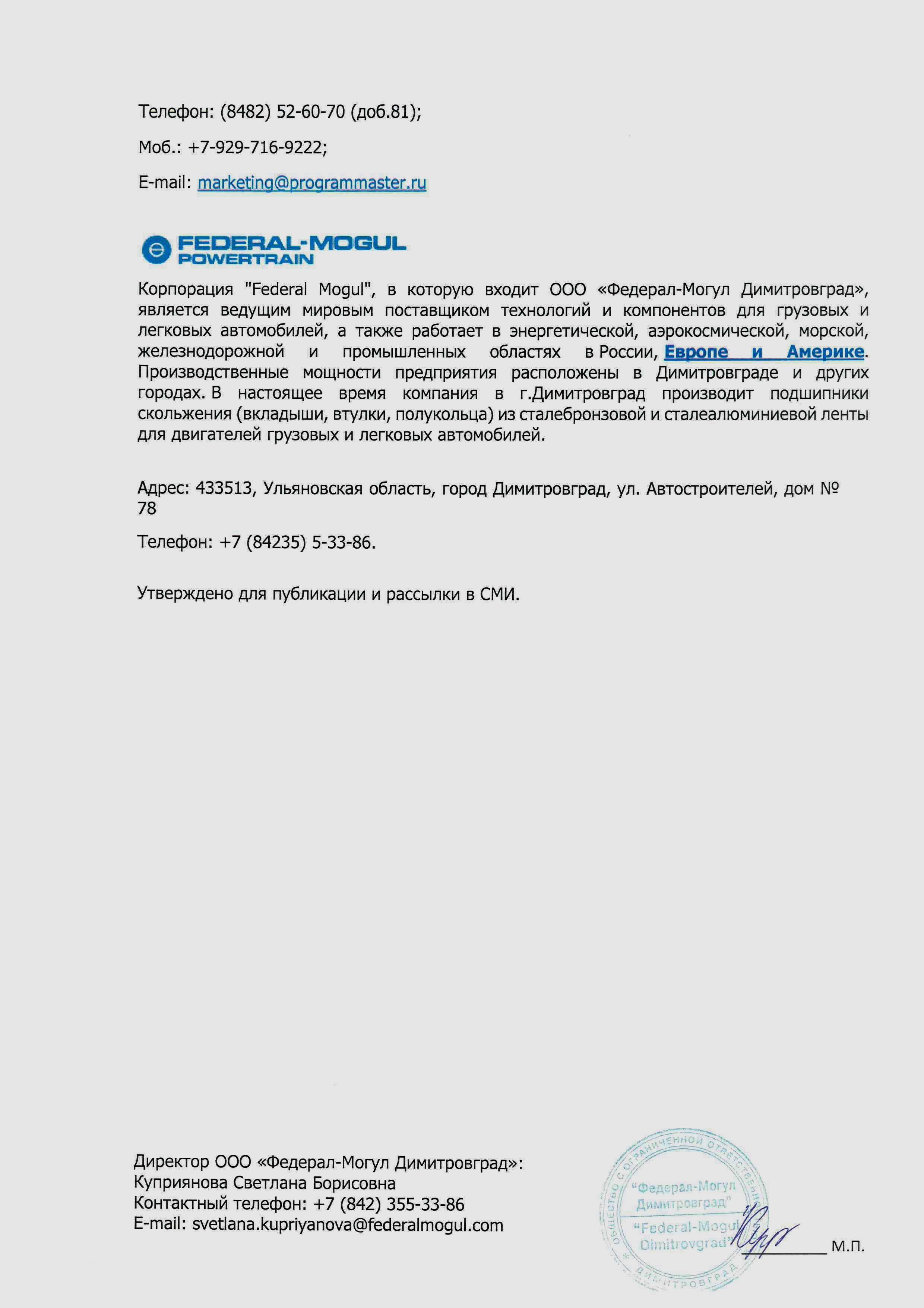 ООО «Федерал-Могул Димитровград» входит в структуру трансатлантической корпорации Federal Mogul, которая является ведущим мировым поставщиком технологий и компонентов для автомобильной промышленности, двигателестроения, сельского хозяйства, энергетики, дорожно-строительной отрасли, а также аэрокосмического комплекса. «Федерал-Могул Димитровград» производит подшипники скольжения (вкладыши, втулки, полукольца) из сталебронзовой и сталеалюминиевой ленты.