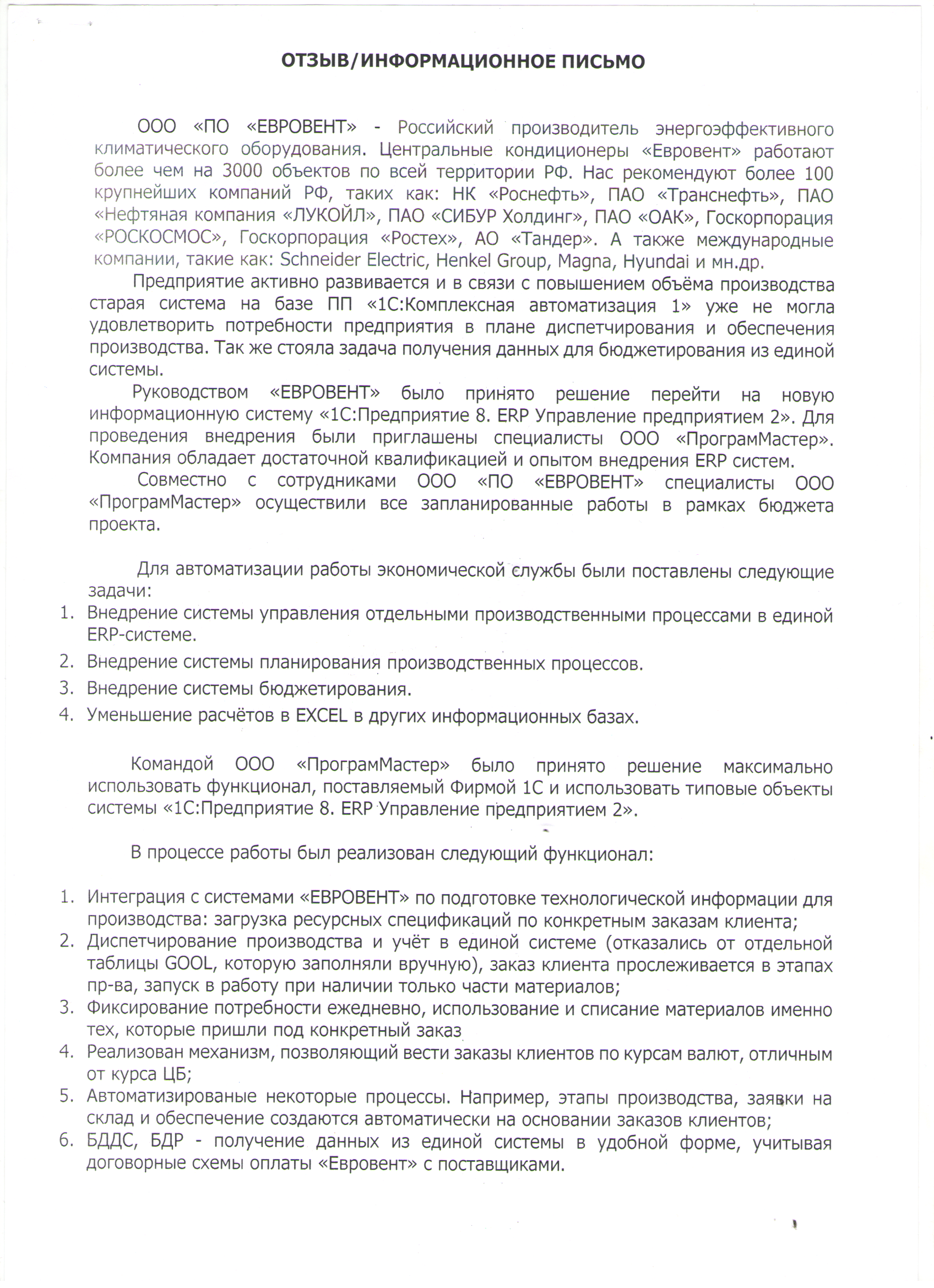 Руководством «ЕВРОВЕНТ» было принято решение перейти на новую информационную систему «1С:Предприятие 8. ERP Управление предприятием 2». Для проведения внедрения были приглашены специалисты ООО «ПрограмМастер». Компания обладает достаточной квалификацией и опытом внедрения ERP систем.