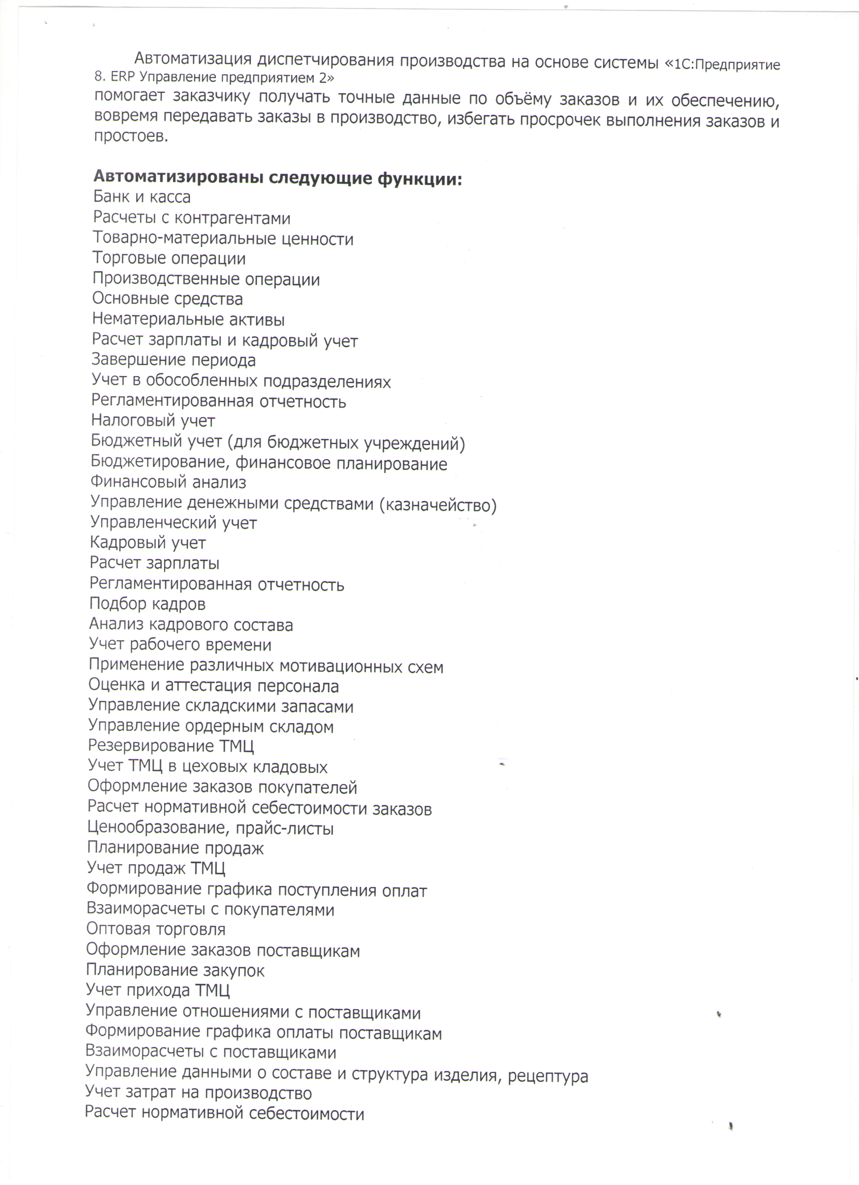 Автоматизация диспетчирования производства на основе системы «1С:Предприятие 8. ERP Управление предприятием 2» помогает заказчику получать точные данные по объёму заказов и их обеспечению, вовремя передавать заказы в производство, избегать просрочек выполнения заказов и простоев.