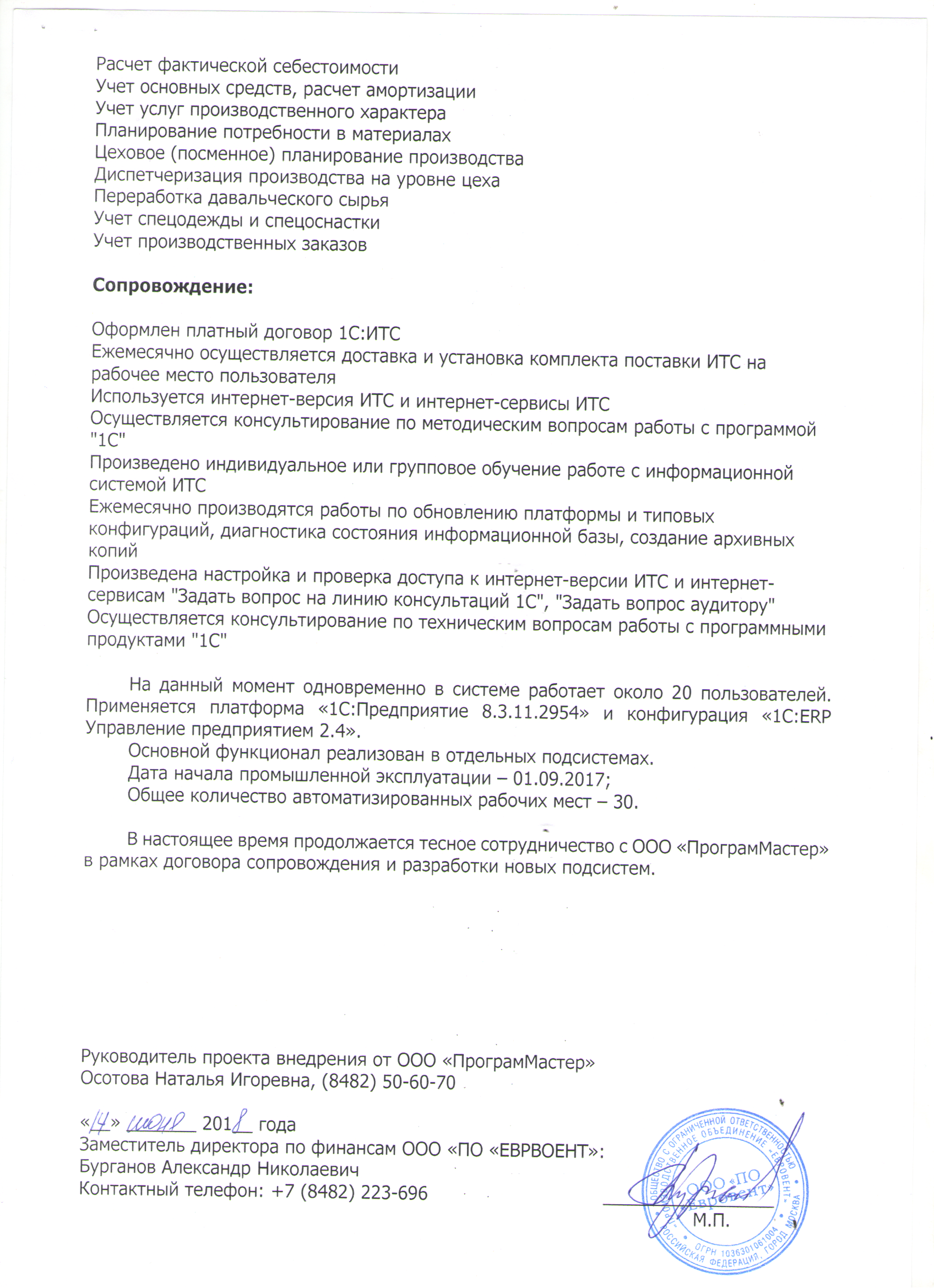 В настоящее время продолжается тесное сотрудничество с ООО «ПрограмМастер» в рамках договора сопровождения и разработки новых подсистем.