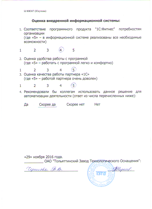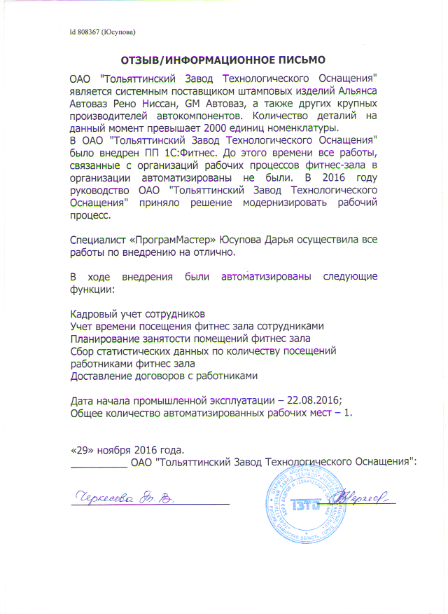 ОАО «Тольяттинский Завод Технологического Оснащения» (1С:Фитнес) - 2016г.