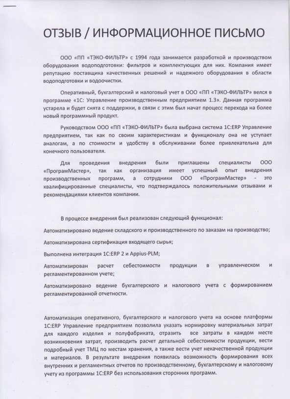 Совместно с сотрудниками ООО «ПП «ТЭКО-ФИЛЬТР» специалисты ООО «ПрограмМастер» осуществили все работы по внедрению.