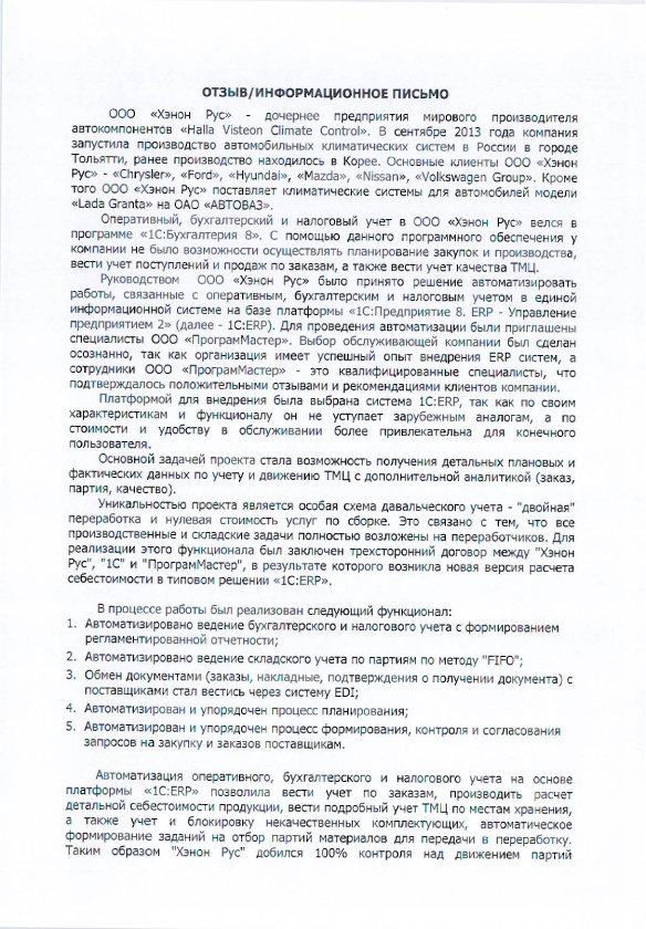 Руководством ООО «Хэнон Рус» было принято решение автоматизировать работы, связанные с оперативным, бухгалтерским и налоговым учетом в единой информационной системе на базе платформы «1С:Предприятие 8. ERP - Управление предприятием 2» (далее - 1С:ERP). Для проведения автоматизации были приглашены специалисты ООО «ПрограмМастер». Выбор обслуживающей компании был сделан осознанно, так как организация имеет успешный опыт внедрения ERP систем, а сотрудники ООО «ПрограмМастер» - это квалифицированные специалисты, что подтверждалось положительными отзывами и рекомендациями клиентов компании.