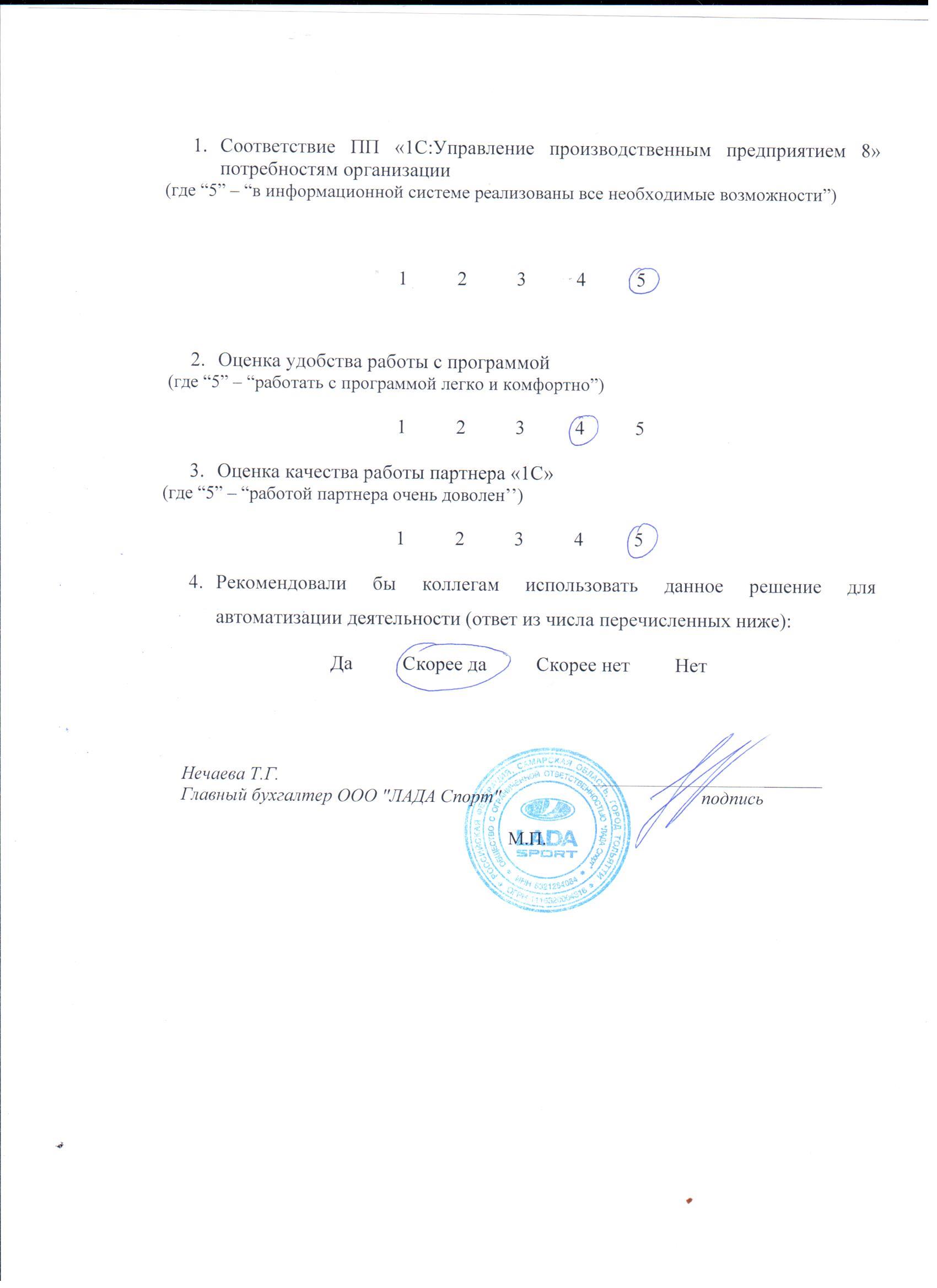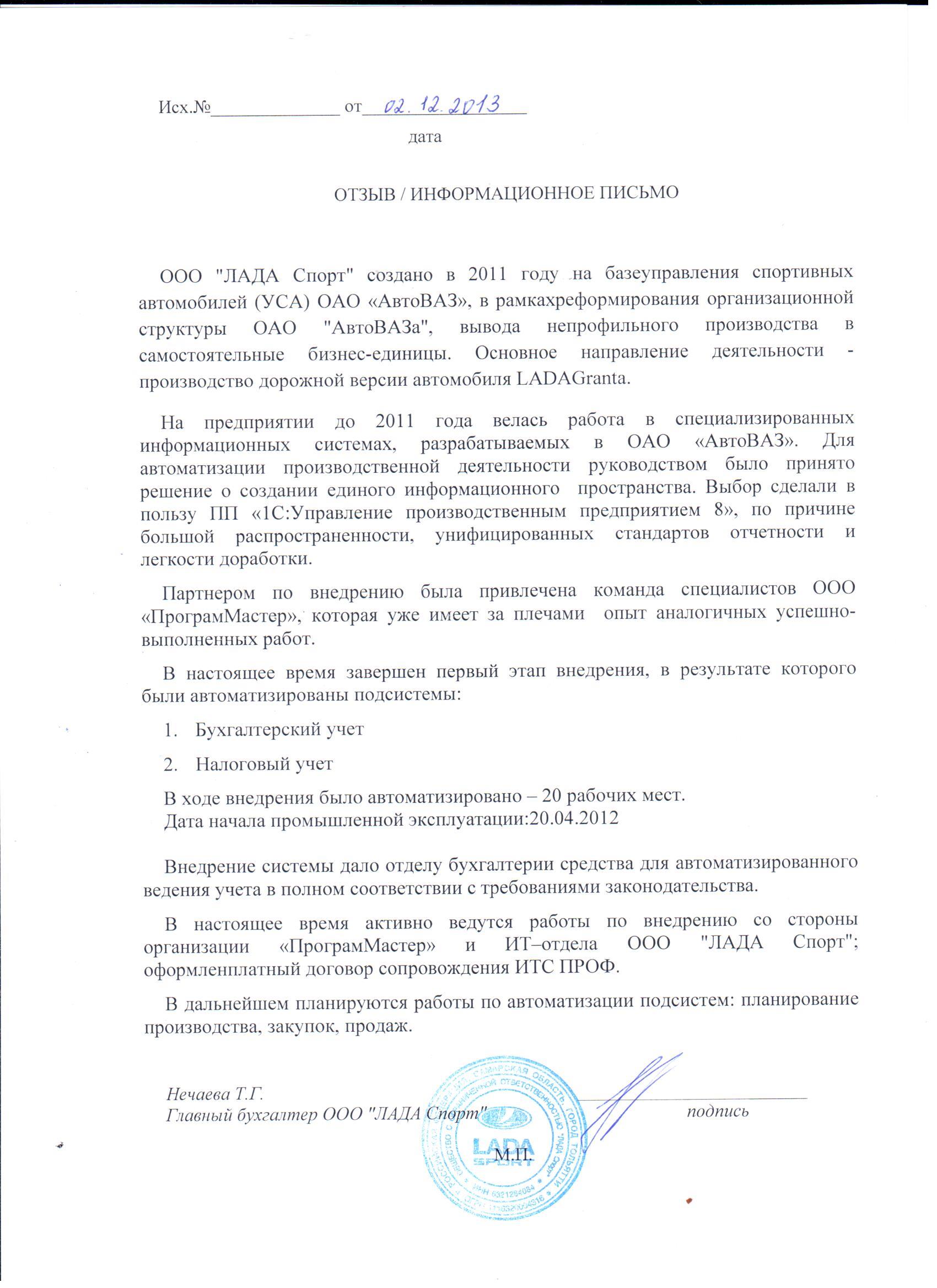 В настоящее время активно ведутся работы по внедрению со стороны организации «ПрограмМастер» и ИТ–отдела ООО "ЛАДА Спорт"; оформлен платный договор сопровождения ИТС ПРОФ.