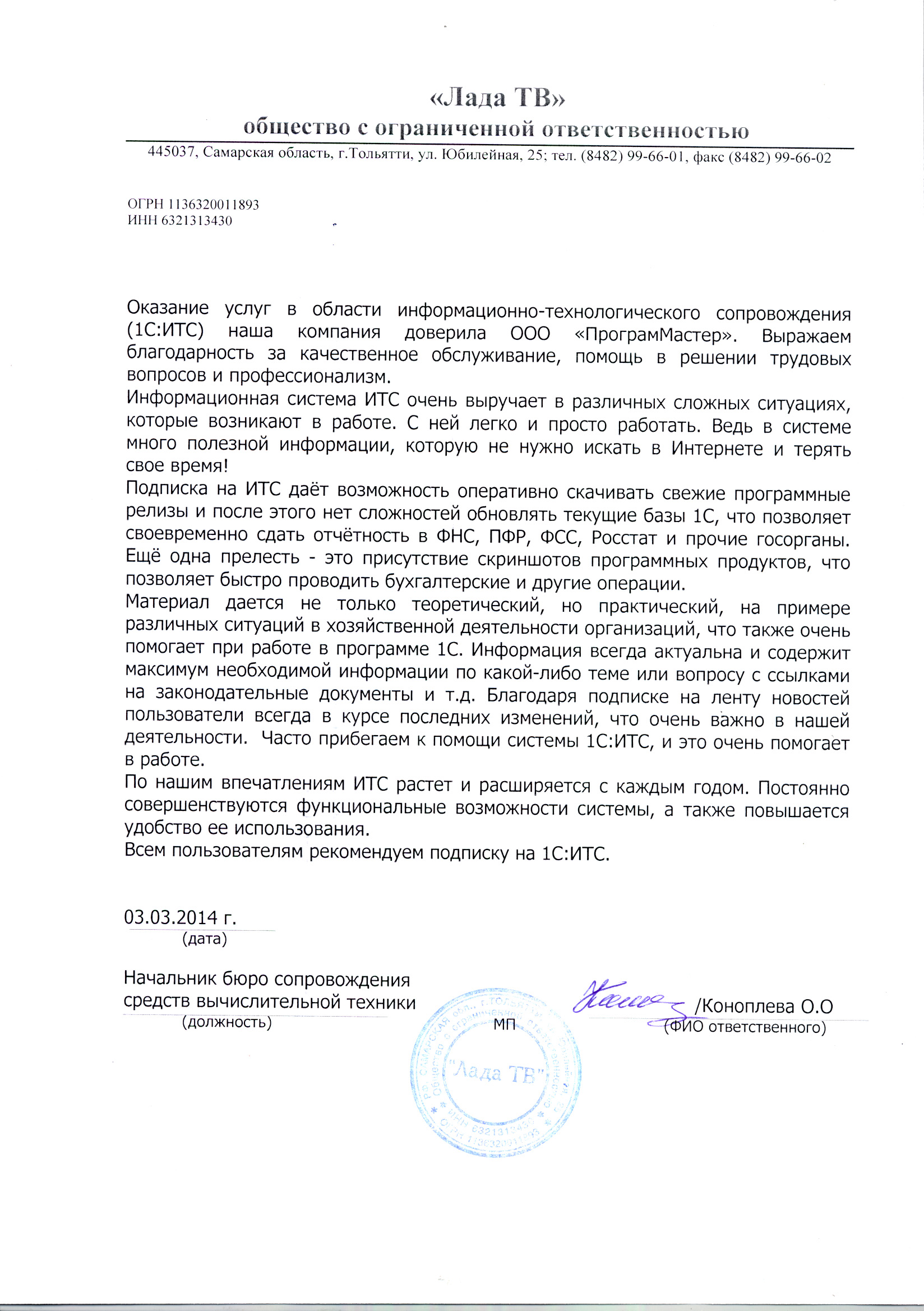 ООО «Лада ТВ» (1С:ИТС) - 2014г.