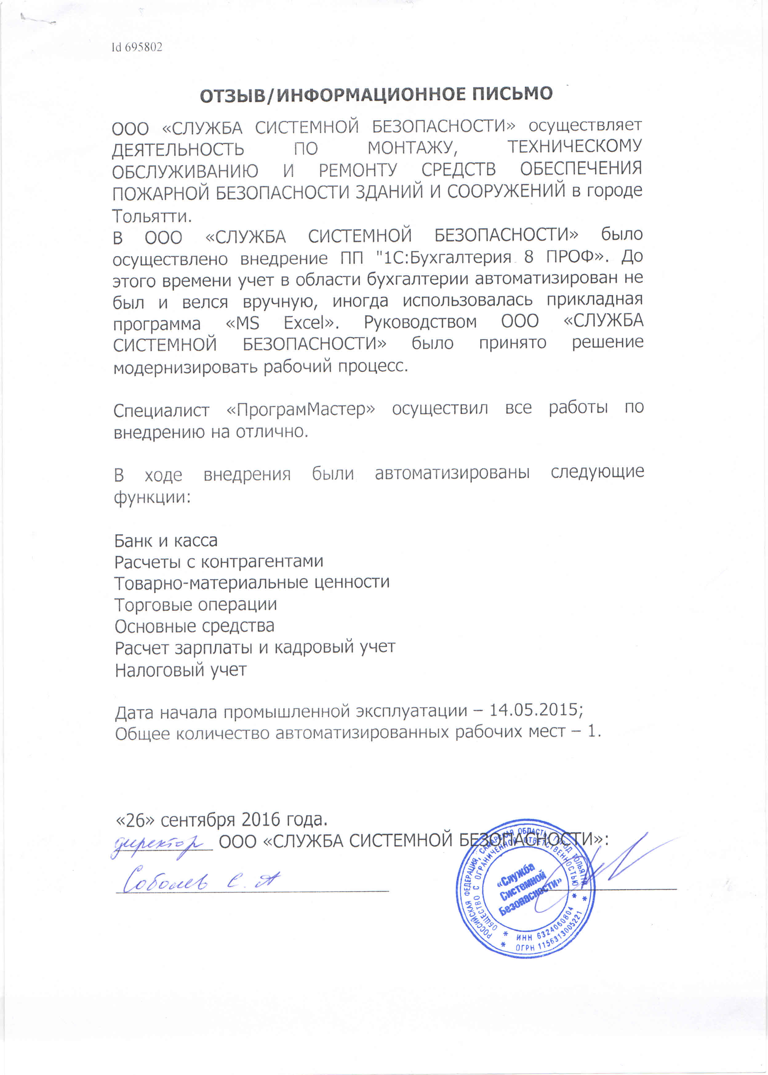 ООО «СЛУЖБА СИСТЕМНОЙ БЕЗОПАСНОСТИ» (1С:Бухгалтерия) - 2016г.