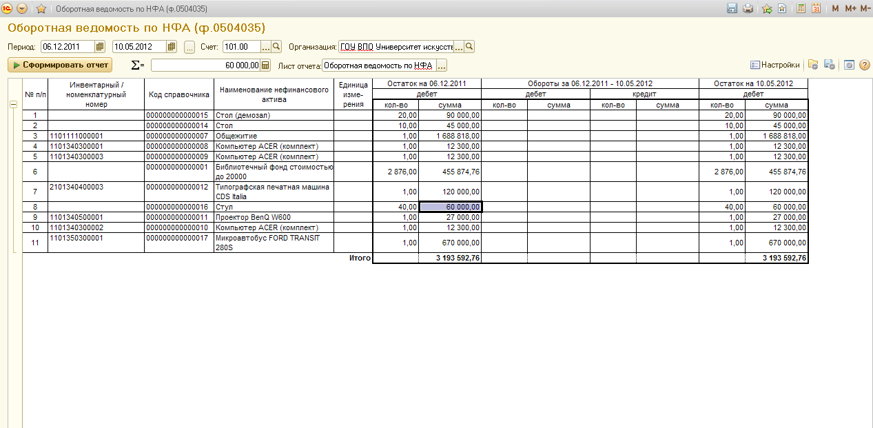 - Нефинансовых активов: основных средств, нематериальных активов, непроизведенных активов, материальных запасов, имущества казны в разрезе номенклатуры, мест хранения, материально-ответственных лиц, учет начисленной амортизации;