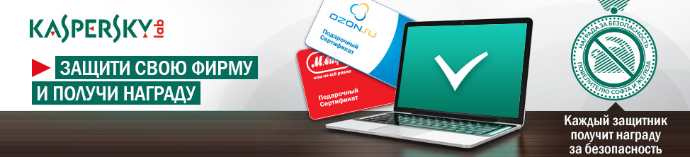 В период проведения акции купите любой из продуктов «Лаборатории Касперского» для защиты вашего бизнеса, зарегистрируйтесь на странице акции и получите в подарок сертификат OZON, М.Видео или WebMoney! Номинал сертификата зависит от приобретенного решения и количества защищаемых узлов.