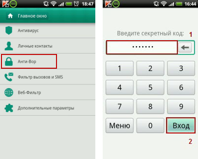 - Выберите Анти-Вор. Введите секретный код и нажмите Вход.