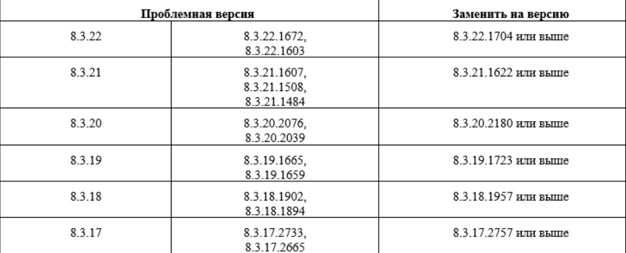 В связи с этим пользователям перечисленных версий рекомендуется до начала рабочего дня 15.11.2022 обновить платформу 1С:Предприятие, как указано в таблице.