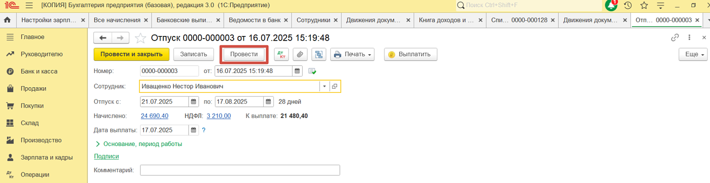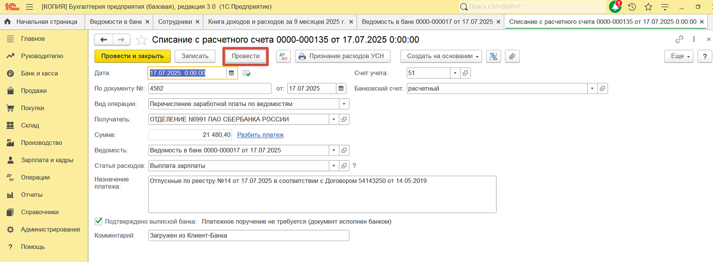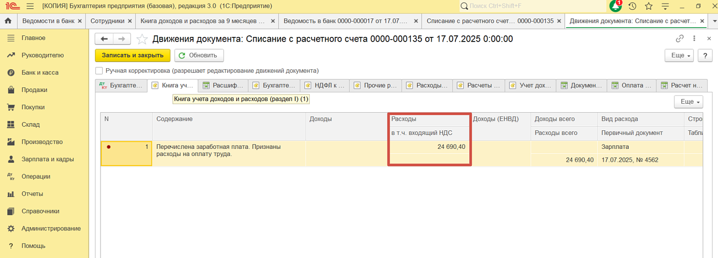 Проверили документы «Списание с расчётного счёта», в движении документа во вкладке «Книга учёта доходов и расходов» в колонке «Расходы» не заполнилась сумма.